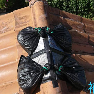 破損箇所が小さかったため、シートで高さを作ってアシスト瓦と土嚢で補修。