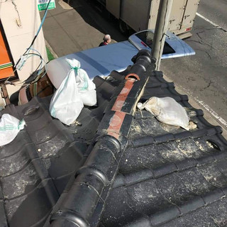 広範囲に貼られていたブルーシートを剥がすと やはり棟瓦がずれていて、その仮復旧になりました。