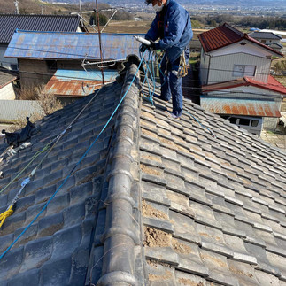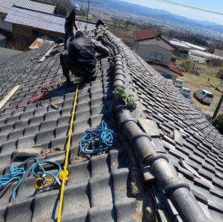 ところが、ここのお宅のご主人、実はいちばんの懸念は屋根の棟瓦。 上がってみると、陸棟は曲がりくねり、一部は落ちた状態。平瓦も50年以上経過しかなりの痛みよう。 ご主人に状況を説明すると、もう葺き替えをしなければならないのは重々分かっているが、 今までから自分で瓦をちょくちょく手をいれてきたので、今回も自分で修理するべくコーキングボンドと銅線を買ってきたので、これで修理して欲しいとの事。 社協の方が、「ボランティアですので、緊急のブルーシートしかできないんです」 「いや、ブルーシートは半年ももたないから、なんとか瓦でなおしてほしい」と、、、 社協の方、私の顔を見られどうしたらいいのか、目で訴えてこられ、、、、 今日も昨日に引き続きどうするべきか、悩みに悩みましたが、いちばん大切なのは被災者の思い、 雨漏りしなければ見た目はどうでもいいとの事でしたので、どうなるか分からないが、とりあえずやってみました。 最終的には上手く銅線とコーキングで固定でき、完成写真を依頼者さんにお見せした所、本当に喜んで下さいました。