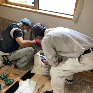 休憩中も、今のお宅の状況や過去の被災地で見たきた事をお話しさせてもらうと、少し微笑みながら気丈に振る舞われている中で、隠して涙をぬぐわれている姿に、こちらもどんな言葉を次に口にすれば良いのかを悩む場面もあった。 午前中で、石膏ボード壁の和室断熱材はほぼ取り除き、午後から腰板が施された壁に着手。 いかにダメージを少なく腰板を取りその向こうにある断熱材を除去するかを、みんなで検討し、手法を共有した。