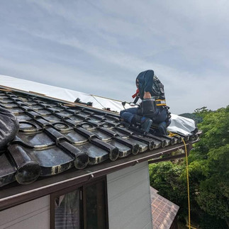 下り棟一部をキャッチヤーを使いシートを張り、防水テープにて対応し完了、大きなずれ、瓦の割れ、雨漏れは無し!