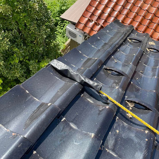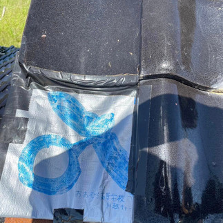 近所さんから大棟の瓦がおかしいよと言われニーズに(!) ハシゴ位置決め、親綱決めで2時間かかりました。屋根状態は、大棟が多少ずれている程度で、シートは張らずの判断、雨漏れもなく、棟の手直しと防水テープで対応しました。 16時には、完了です。 家主さんも喜んでいただきました(!)