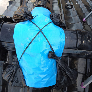ぼろぼろと崩れ落ちる砂に悪戦苦闘。瓦を綺麗に清掃した上で、飛散防止のためブルーシートの端を防水テープで固定、最後に黒色の土嚢袋を載せて完了。雨漏りしている部分の屋根を確認したところ、天窓のコーキング剤が痩せ細り隙間が空いていたので、天窓の枠を防水テープで処理させていただきました。他に目立って穴空き箇所がないため、これで一度様子を見ていただくことにしました。