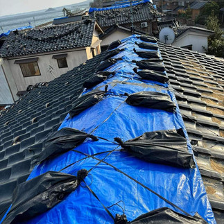 午前中に一度屋根ブルーシート張りは完了したものの、強風によるメクレがあり、ブルーシート張り直し。キャッチー部に重し代わりに黒土嚢袋に瓦を入れて煽り防止。更にマイカ線で補強。土嚢袋もマイカ線で縛りズレ防止をしました。