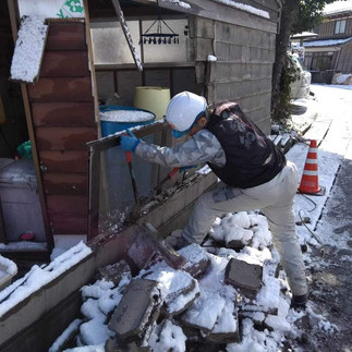 道路に倒れた20m程のブロック塀を削り機で砕きながら空き地に移動。手で倒れそうなブロックも撤去しました。追加で神棚の移動もしました。