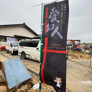 石膏ボードは一枚が約30キロと重量物につき50センチ角に切断し、ガラは土嚢袋に入れ。ブルーシートについては、石膏ボードが剥がれ落ちた後は野地板の構造に付き、ブルーシート張りは比較的、短時間で完了しました。家財も家主さんが運びやすい位置まで運搬していた為、短時間で終了。大通りに面して、交通量も多い事で、一般ボランティアに早めに回収依頼を社協にお願いしたところ、我々の作業終了のタイミングで回収に来ていただいた。愛知人と一般ボランティアの連携で瓦礫の運び出しまで14時には完了できました。リーダーのゲームメークのうまさが勉強になりました。