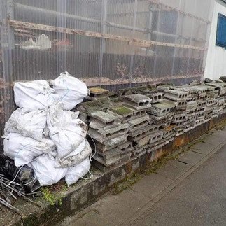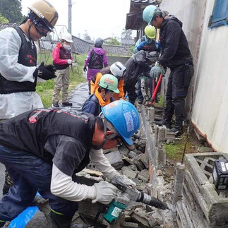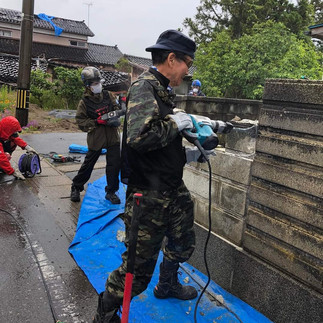 家主さんは仮設住宅で生活中で、自宅は解体予定。最初に一番長い塀を両端からと、離れ小島の短い塀を解体。ハツリ班とブロック処理版に分かれて作業。休憩時間に、ハツリを途中で交代する意見が出たので、ハツリ+ブロック処理をペアにして、時間を決めて交代することに。次に隣の家との境の塀を両端と真ん中から解体。隣の家の保護のためコンパネを使用。その間残りのメンバーで、最初に解体したブロックの場所に回収してもらうブロック置き場を作る作業を並行した。家主さんもハツリが使える方だったので、10人目のメンバーとして大活躍!今回は全員リーダーで、意見を出し合いながら作業ができたのでとてもスムーズだった。