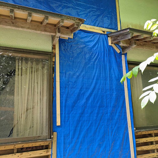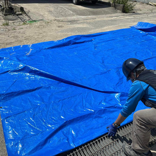 ①離れの屋根のブルーシート張り。崩れた棟瓦を下ろし、瓦を差し替え、棟にブルーシートを張り防水テープで隙間なく接着。