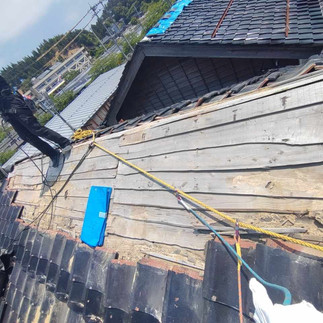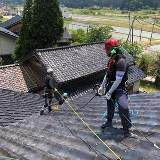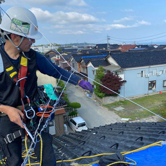 昨日からの継続案件。親綱を張り、屋根に蔓延る蔦をとったり、崩れた棟瓦を前日に下ろしていたので、陸棟ふたつ、下棟、平瓦差し替え、谷樋清掃等。下準備のおかげでミッションコンプリート。撤収前に地上で作業してくれていた、かなさんにも屋根に上がって頂き、おっくんが屋根のノウハウを丁寧に教えてくれました。