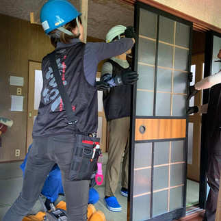 午後は、昨年も屋根の応急処置で入ったお宅に行きました。納屋の扉が、地震で4枚中2枚壊れてしまい、開かなくなってしまったとのことで、午前中のチームに野間口さんが加わってくださり、のまさん棟梁に学びながらの作業に!のまさんの動きに「何でそこに胴縁を貼るんだろう」「何でそこにビスを打つんだろう」と思ってしまいますが、みんなで考えたり質問したりして、時に「こうしてみたらどうでしょう?」とも提案しながら、進めることができました。技術を身に付けることでできることの幅が広がることを実感しました。ご依頼主のお母さんが「見た目が変わってくれるだけで気持ちも変わります。ありがとうございます」と喜んでくださったので、2時間ほどの短い時間でしたが、お手伝いできて良かったなあと思いました。