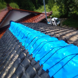 昨日からの継続案件で納屋の屋根作業。平瓦を再度入れ直して一部固定。崩れた棟瓦は整えて防水テープで固定。ブルーシートを三つ折りにして棟にかぶせました。シートの剥がれ防止はマイカ線としました。