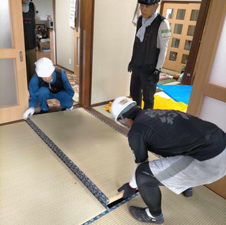午前中は家財出し。解体も迷ったものの、80過ぎたおばあちゃんがここを離れたくないと住み続ける選択をしたお宅でした。今日のメンバーは、宮城から一緒に来た東日本大震災の時のボランティア仲間の千田さんと、岐阜から来たの皆さんと、愛知から来た春日井市社協の皆さん。各々が自分たちの持参したものや経験をすごく活かしてくださり、素晴らしいチームワークでした!愛知人での下見はできていなかったので、事前資料からみんなで想像を膨らませながら作戦会議。2階から家財や畳を出す作業と、1階の畳の張り替えの作業と、家の外出から瓦と壁材を分別する作業がありました。現地に着いてから、必要な作業や動線を家主さんも交えて一緒に確認し、搬出チーム、畳チーム、分別整理チームが自然とできました。まず、岐阜チームがジャッキを持って来てくれていたのが素晴らしかった!地震で歪んでしまったために開かなくなっていた扉があったのですが、そのジャッキのおかげで扉が開くようなり、大きな家財を運び出しやすい動線が確保されました。そして、春日井市社協のお二人も、2階から重いものを運ぶ作業に大活躍!各々が自分のできることを考えながら、家主さんのことを考えながらしてくださったおかげで、1日かかると思った作業がとってもスムーズに進み、半日で終えることができました。終わった頃におばあちゃんと、応援に来ていた娘さんとお話したのでずか、おばあちゃんもとっても喜んでくださり、娘さんも「これでお母さんが10年長生きできます」と喜んでくださりました。私たちは「10年と言わずもっともっと長生きしてくださいね」と返しました。参加してくださったチームの皆さんからは「人手がないとなかなかやれないことだと思うから喜んでもらえて良かった」「ボランティアさんが気持ちよくやってくれるから励みになる、と言われて、自分たちの方が励みになる」との感想をいただきました!