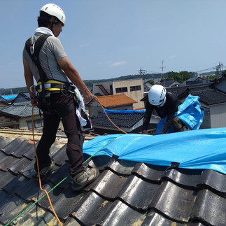 昨日からの継続案件。2つの棟にターポリンを張りました。緩衝材のブルーシートの上に防水テープとマイカ線で施工しました。依頼者さんには三日間お付き合いいただき、作業後のスイカをおいしく頂きました。
