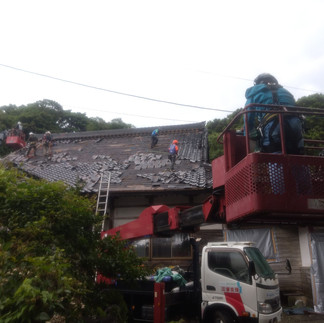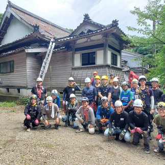 午前、一時、警戒レベル4警報が出てた雨も、午後から雨が上がり、作業ができた一日でした。今回の作業は、お堂の瓦をすべておろし、ターポリンを胴縁で固定する作業を、レスキューアシストさんをサポートする形で、DRTさん、チームふじさん、愛知人、合同で行いました。午前は、雨ですぐには作業ができず、珠洲市自然休養村センターで、作業の段取りの打ち合わせを実施。小雨になったお昼直前に親綱を張り終えました。張り綱は、棟をまたいで、支点をお堂前と後ろに張りました。屋根に登るメンバーは、小綱をプルージックで親綱に固定し、作業をしました。瓦は数が多いため、地面には屋根から投げ下ろしました。平瓦は、立てて回転しながら投げ下ろすと、割れにくいということを教わりました。投げ下ろした瓦を下で回収する人のけが防止のため、「投げます」「回収します」「回収完了」の声掛けを心掛けてもらいました。残った仕上げ作業は、明日行います。