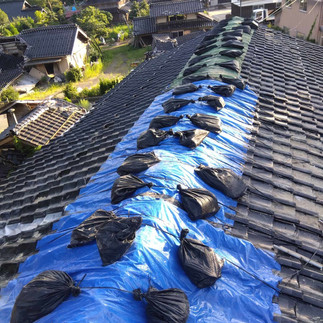 金沢の2時避難先から最近自宅に戻られたお宅での作業。室内の片付けもまだ済んでいないそうです。業者さんが張られたブルーシートが飛ばされてしまい、瓦屋さんがいつ来られるのか決まってないので、少しでも長く持たせる為にシート張りをすることにしました。仕上げは見習い3人でマイカ線固定の講習を受けて実行。弛みすぎず、張りすぎず調整しながらは慣れるまで大変でしたが無事に固定。最後は不要な棟瓦を降ろして無事に完了しました。