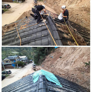 下屋は、ほぼ全面にかかっていた古いブルーシートを取り除くことから始めました。結果、30枚近くの瓦が欠損を発見。全箇所、お宅に保管されていた予備瓦を余震で落ちないよう、スクリューや防水テープで止めて、設置しました。