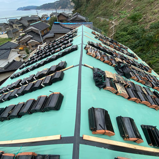 午後からは小林さんが合流してくれて、主に下屋の補修。割れた瓦3枚は差し替えて、瓦のない軒の部分は寸法を測りブルーシート張りをしました。シート押さえに使う胴縁もカットし、シートを綺麗な瓦の下に潜り込ませ、上から胴縁で留めて、最後に防水テープで止めました。終日少人数で最後は会話も減るくらい疲れましたが、お互い相手の動きを見ながら効率良く動けて、同じような作業を前々日から別案件でもしていたので、私自身下屋の補修がだいぶ理解できました。