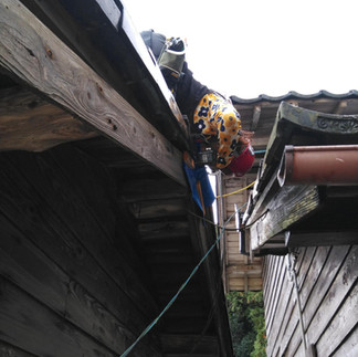 下屋の割れた瓦の差し替えを保さん、別の下屋で複数枚割れたり落ちてしまっていたところに瓦を並べるのを小林さん、そして隣の小屋の屋根も瓦が多くずれてしまっていたので、そこから小林さんのところへ使える瓦をパスするのをレイア、という形で作業開始。保さんと小林さんの対応していたところが完了してからは、3人で小屋に残った瓦の並び替えと、瓦が足りないところへのターポリン施工、そして棟瓦へのシート張りを行いました。天気も不安定なため午前中完了目標で挑み、お昼過ぎてはしまいましたが半日でなんとか完了することができました。