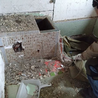 昨日からの継続案件。地震にて剥がれかかった壁などのリフォームに向けた作業。お風呂は浴槽の解体、廊下は土壁の一部を撤去。浴槽はハンマーやバールなどを使って人力で実施。明日の台所作業に向けてテーブルと食器棚の移動も実施。一般参加のボランティアにて搬出も行われかなりすっきりとした現場となりました。
