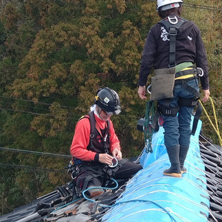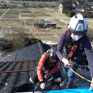 今日も保っちゃん、浩美さんと3人での活動。午前は公費解体までの間、家財を守りたいとの一度張った棟瓦のブルーシートの張り直し。午後は現在も住んでおられるが、同じく瓦屋さんが入るまでのブルーシートの張り直し。先ず私が先陣をきり、上に上がり状況確認。安全確保のやり方を決定したら、浩美さんがハシゴ固定、アンカー。保っちゃんが小綱、マイカ線等の必要物品を上げて作業開始。昨日に続いて今日も何言わずとも、阿吽の呼吸でそれぞれの役割分担が出来るので、仕事が早い早い。棟瓦にブルーシート、マイカ線仕上げで完了。
