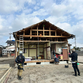 部分公費解体のお宅で、切断面に張ってあったシートをターポリンに張り替える作業を実施しました。当日は花粉や黄砂の影響で、くしゃみや鼻水に悩まされながらの作業となりました。作業は高さ約5メートルの場所での高所作業を伴うため、安全管理に留意しながら進めました。野村さん、けんたさん、らなちゃんの地上班は丸ノコやインパクトを使用し、手際よく話し合いながら作業を進めました。岡崎消防チームの高所班は上部の三角部分のシート張りを中心に作業を行いました。当初、作業前にイメージを共有したつもりでしたが、作業を進めるうちに形が変わってしまい、最終的な見た目が想定と異なる状態になってしましたが、その後、猪股隊長に手直しをしていただき、作業は無事に完了しました。今後も今回の経験を活かし、より精度の高い作業を目指していきます。