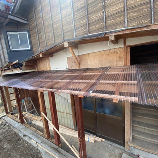 ひのきしんセンターからの継続案件。今日も廃材の波板を、不揃いなので切ったり足したりしながら、屋根を張るところまで完了。廃材にも関わらず、水平、平行ラインもしっかりと整った想像以上の仕上がりに、被災者さんも大変喜んでくださいました。