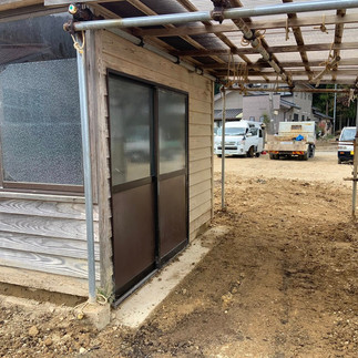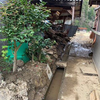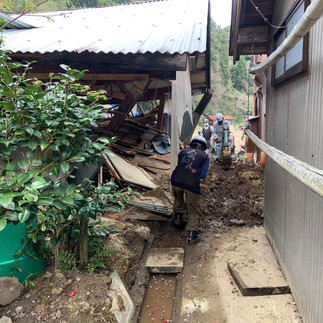 物置の物品を搬出する為、周辺の土砂出し。ユンボとシャベルにより実施。鉄管類やシャベル、電動工具を救出。土砂出し中に物置のブリキ板も潰れていた為、住人の要望に応えて撤去し処分場へ運び出し。