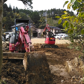 小屋に水が入らないように、水路作成と周囲の整備。ユンボとスコップにより実施。土砂出し後に畑にしたいとのことで、レイアユンボで表面を削り、水がはけやすいように森ユンボで整備。細かいところはスコップ隊で整備。取り除いた土砂はユンボで地ならししました。ユンボと人海のコラボ戦術が依頼者さんの笑顔に繋がりますように!