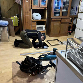 床下への侵入口が2か所あったため、まず台所を養生してからサーキュレーター回収・消毒を実施。同時に、こんちゃんとちひろさんにはもう一方の侵入口の養生をしてもらい、その後ほぼ同時進行でサーキュレーター回収と消毒を行いました。