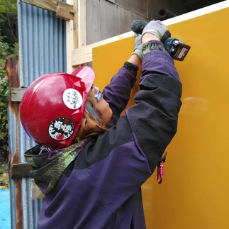 納屋の表にブルーシートをかけて雨風を避けていたようですが、バタつきも気になるのか、材料費は依頼者さんが出すとのことなのでコンパネで壁を作る作業をさせていただきました。これまでも大工案件は何度かさせていただきましたが、大工案件が得意な先輩方の元で、ご指導いただきながらの作業ばかり。私とコバちゃんだけでできるか少し不安はありましたが、これまでご指導いただいたことを思い出し、依頼者さんが喜んでくださったら良いなあという気持ちで2人で相談しながら作業しました。