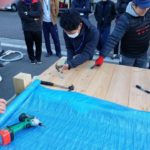 具体的に被災後 屋根上・床下がどう成ってしまうのか、どの様に処理をすれば被災者様方々がいち早く復興へ向けて一歩を踏み出して貰い易く成るのかを説明させて頂く為に 屋外駐車場へそれぞれの模型を持ち込み、模擬体験をして頂きました。
