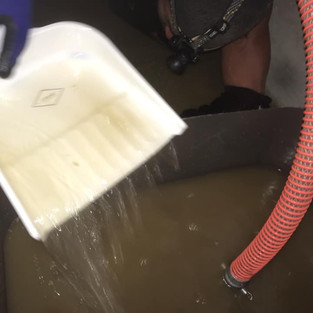 午前中に伺った際に水位が数cmあった泥水をゼロポンプを使用して外へと吸い上げる作業でしたが、床下部分にはわずかな高低差があるため2人がかりで床下へ潜ってポンプの吸水部分へと泥水を送り込む。 地道な作業でしたが無事床下の吸い上げ完了致しました。